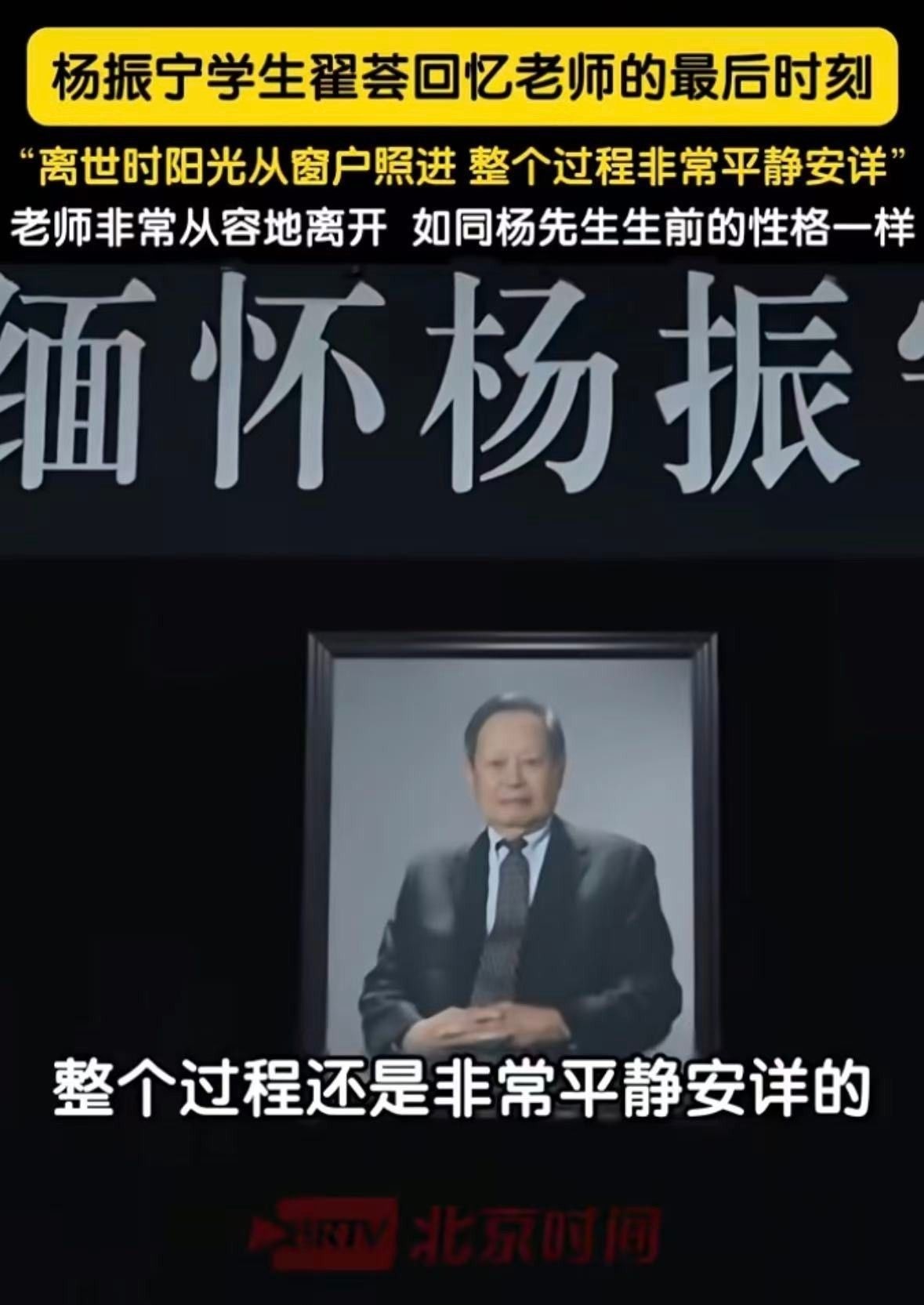 杨振宁的学生翟荟亲眼见证了导师的离去。他表示,先生走得很平静,如同他一生为人一般——低调、从容、毫无喧哗。那一刻没有痛苦挣扎,只有安详宁静,仿佛只是进入了另一段沉思。