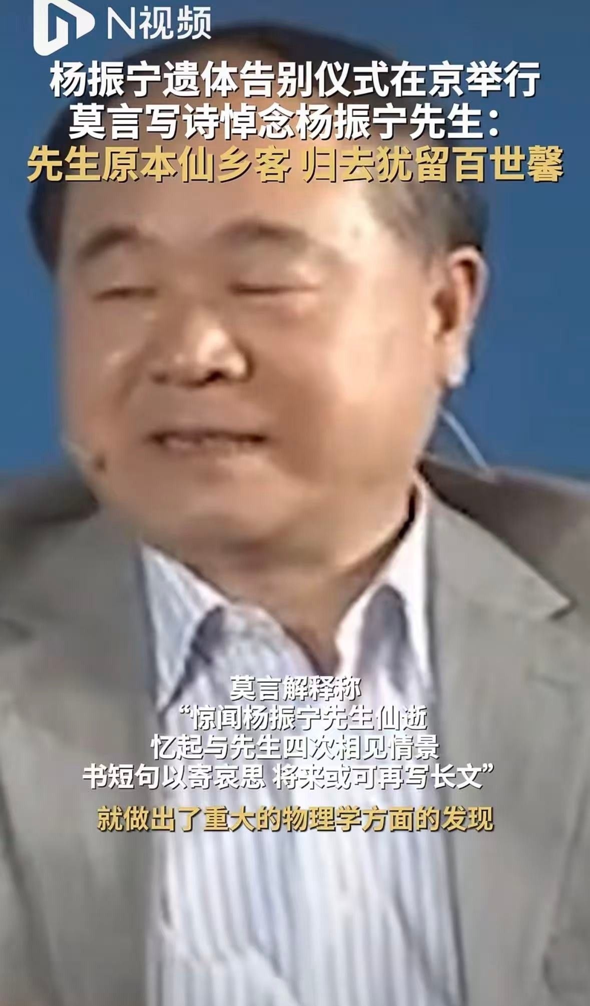 诺贝尔文学奖得主莫言听闻杨振宁先生今日举行追思仪式,特地创作一首悼诗寄托哀思: