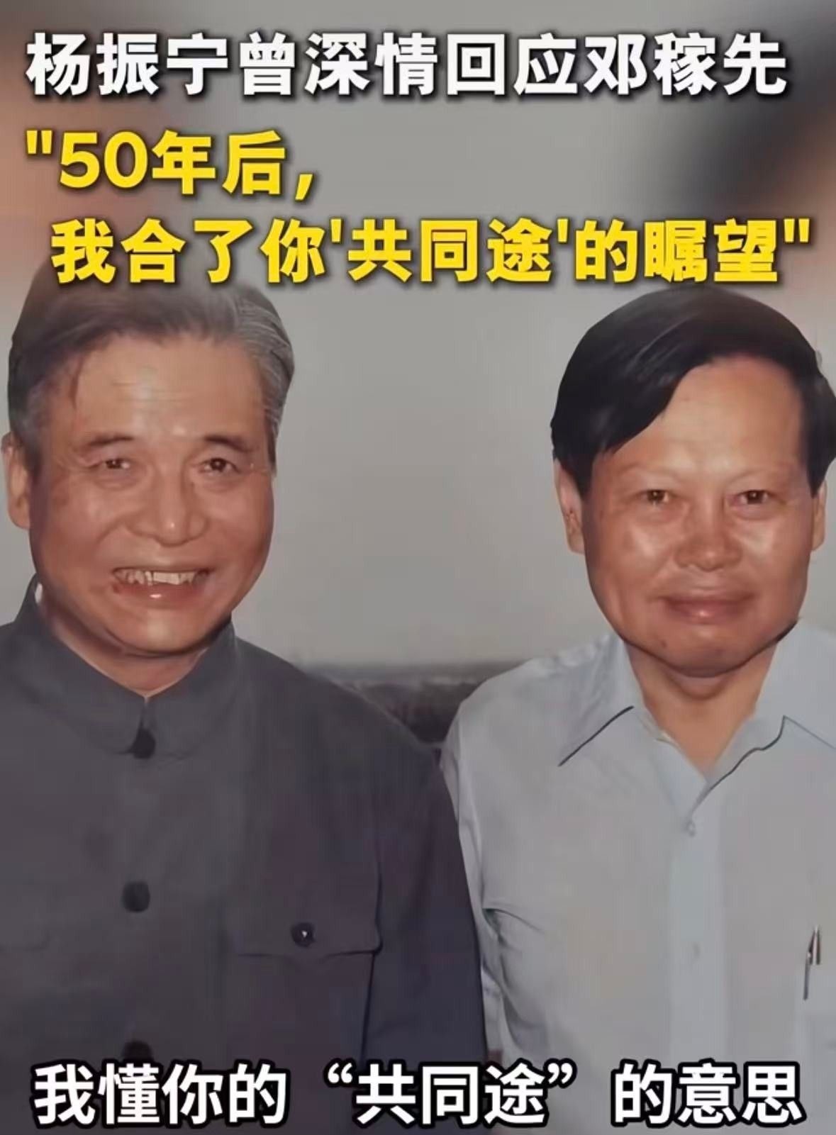 两人自中学时代相识,同窗共读,情谊深厚。当年得知邓稼先成功研制原子弹的消息时,身处海外的杨振宁虽不能归国,但内心澎湃不已。邓稼先曾在信中深情写道:“但愿人长久,千里共归途。”